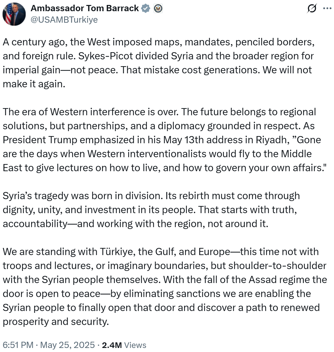 Is the era of Western interference over? That’s at least what Tom Barrack, US Ambassador to Turkey and Special Envoy for Syria, wrote in a tweet on X on Sunday 25th May 2025, as reported also by Al Mayadeen: