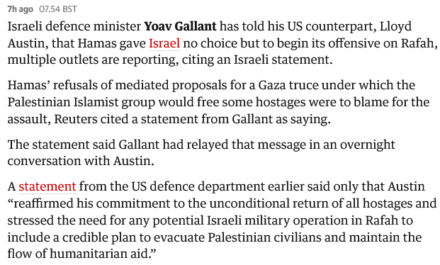 In practice they are blaming Hamas for the military operation in Rafah as a consequence of Hamas’s attack on the Kerem Shalom crossing and for not accepting Israeli conditions for a truce, though Hamas affirms that the “threat to invade Rafah will not pressure it in course of talks” and that “considering occupation's [i.e. Israel’s] threat of complete or partial invasion of Rafah, Hamas may halt ongoing talks” (source: Al Mayadeen).