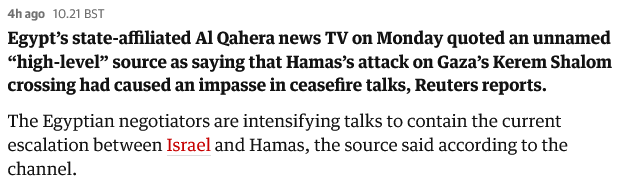 By the way, as reported by The Guardian, “Germany’s foreign minister Annalena Baerbock has criticised Hamas for a rocket attack near the Kerem Shalom crossing at the weekend which killed four Israeli soldiers”, however she does not have anything to say about the hundreds of Palestinians dying every day.